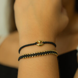 «Brillo eterno, fuerza interior: pulsera de onix y bolitas en oro 18k.»